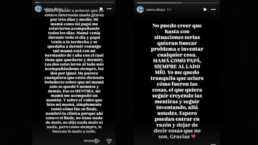 El clima de tensión que rodea históricamente a Nicole Neumann y Fabián Cubero sumó un capítulo inesperado, pero esta vez protagonizado por una de sus hijas. En las últimas horas, Allegra Cubero decidió abandonar el perfil bajo para enfrentar las versiones que circulan sobre la relación con sus padres y su estado de salud. A través de un descargo directo en su cuenta de Instagram, la adolescente dejó en claro su postura frente a la exposición mediática que la tiene como centro involuntario.
