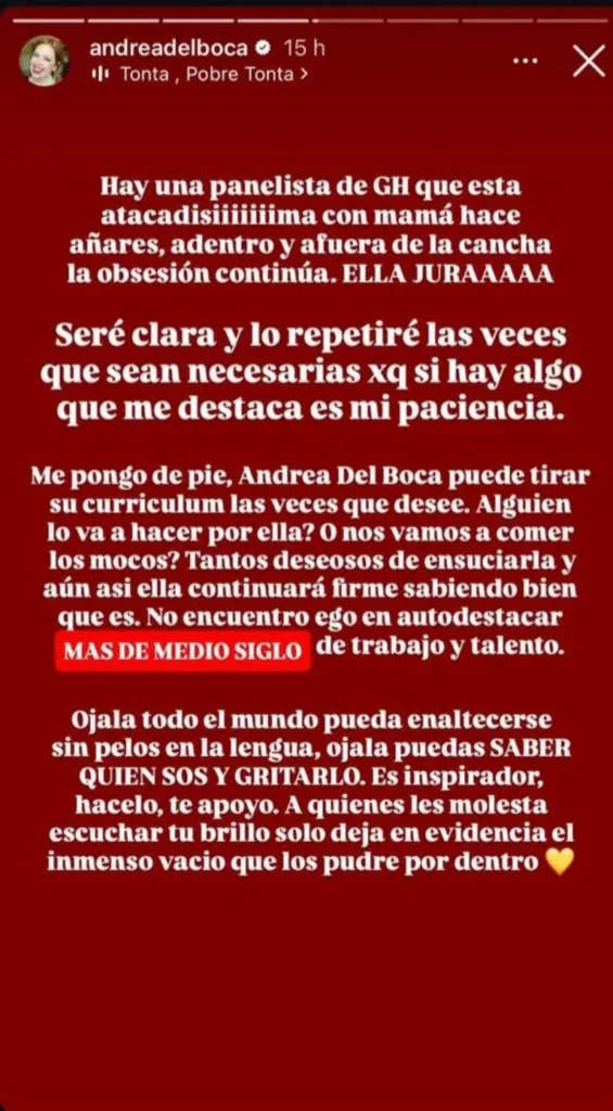 Lejos de moderar el tono, Anna reforzó su postura con una defensa directa de la trayectoria de Andrea del Boca. “Puede tirar su currículum las veces que desee”, lanzó, en una referencia clara a más de cinco décadas de carrera en televisión.