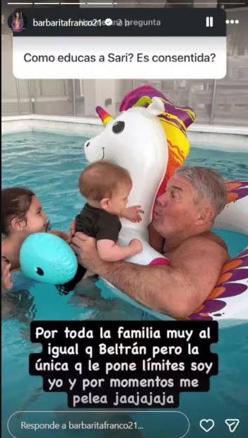 Otro momento que tuvo repercusión fue cuando le consultaron si Sarah es consentida y cómo maneja los límites en casa. Sobre una imagen familiar, Barby respondió con una frase que circuló rápido: “Por toda la familia, muy al igual que Beltrán, pero la única que le pone límites soy yo”. Con humor, reconoció que ese rol no siempre es fácil, pero lo asume con convicción.