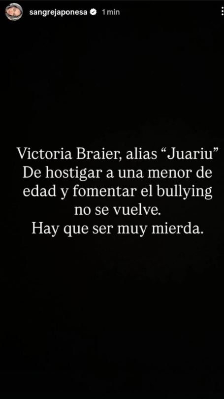 “Victoria Braier, alias ‘Juariu’. De hostigar a una menor de edad y fomentar el bullying no se vuelve. Hay que ser muy mierda”, escribió la actriz, sin vueltas y con nombre y apellido.
