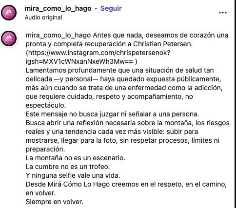 “Esto no es un chisme ni un espectáculo”, dejaron claro desde Mirá cómo lo hago, el grupo con base en Neuquén y Cipolletti que acompaña y prepara a personas para enfrentar la exigente travesía al Lanín. El primer gesto fue humano: desearle una pronta recuperación al chef y lamentar que una situación de salud tan delicada haya quedado expuesta públicamente, sobre todo cuando involucra una enfermedad como la adicción.