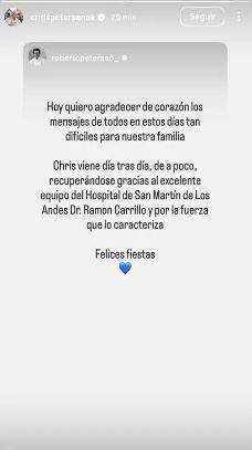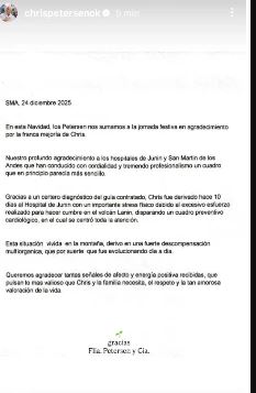Aun así, el comunicado trajo una señal de alivio. En plena Navidad, los Petersen agradecieron “la franca mejoría” de Christian y aseguraron que su evolución es positiva, día a día. El mensaje cerró con un pedido implícito: respeto, calma y valoración de la vida, en un momento donde cada avance cuenta más que cualquier precisión médica.