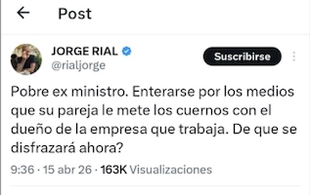 En pocas líneas, el periodista habló de una supuesta infidelidad que involucraría a una conductora, un ex funcionario y un empresario de medios. Sin confirmaciones públicas, el posteo alcanzó para que el tema se metiera de lleno en el cruce entre política y televisión.