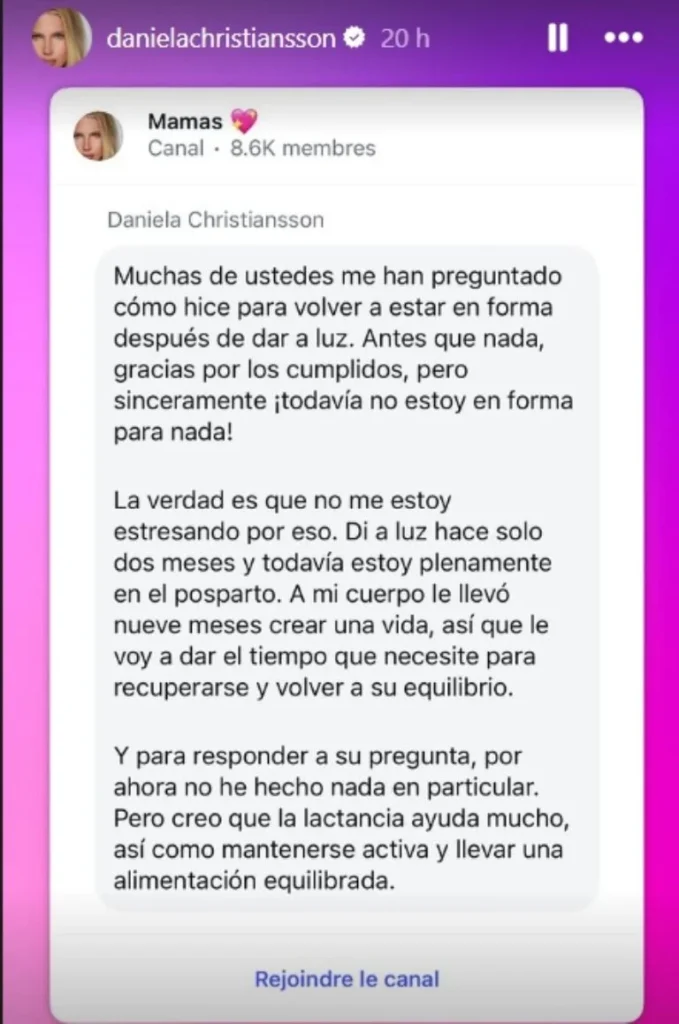 Por ahora, Daniela Christiansson dejó en claro que su prioridad no pasa por el espejo, sino por atravesar el posparto sin presiones mientras disfruta de su familia junto a Maxi López y sus hijos.