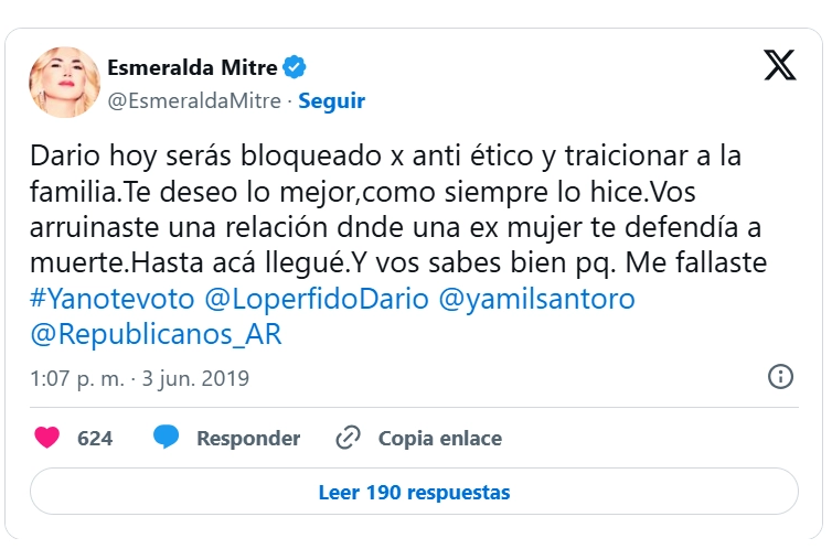 Tras el divorcio en 2018, la narrativa cambió drásticamente. Esmeralda Mitre bloqueó a Lopérfido en redes y lanzó una acusación que hoy, tras la partida del ex funcionario, resuena con fuerza: lo tildó de “antiético” y denunció una “traición a la familia”.
