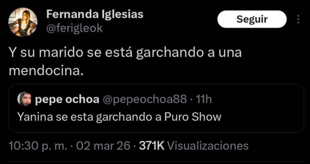 Iglesias decidió contestar sin rodeos y publicó: “Y el marido se está garchando a una mendocina”.