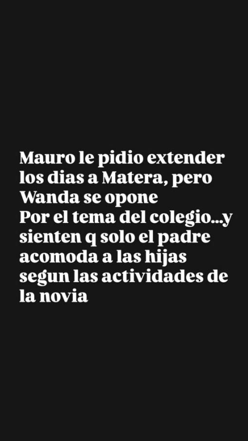 En paralelo, también surgió una diferencia por la duración de las visitas. Icardi habría pedido extender el tiempo con sus hijas, mientras que Wanda se opuso por la cuestión escolar.