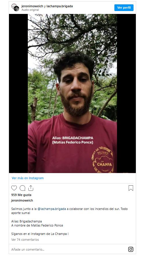 Weich eligió reírse un poco de ese estereotipo cómodo —el “hippie con Osde”— mientras mostraba a su hijo poniendo el cuerpo en un territorio arrasado. El contraste fue inmediato. Porque Jerónimo no estaba opinando desde lejos ni compartiendo consignas: estaba metido en el operativo, con otros brigadistas, intentando frenar lo que se puede frenar.