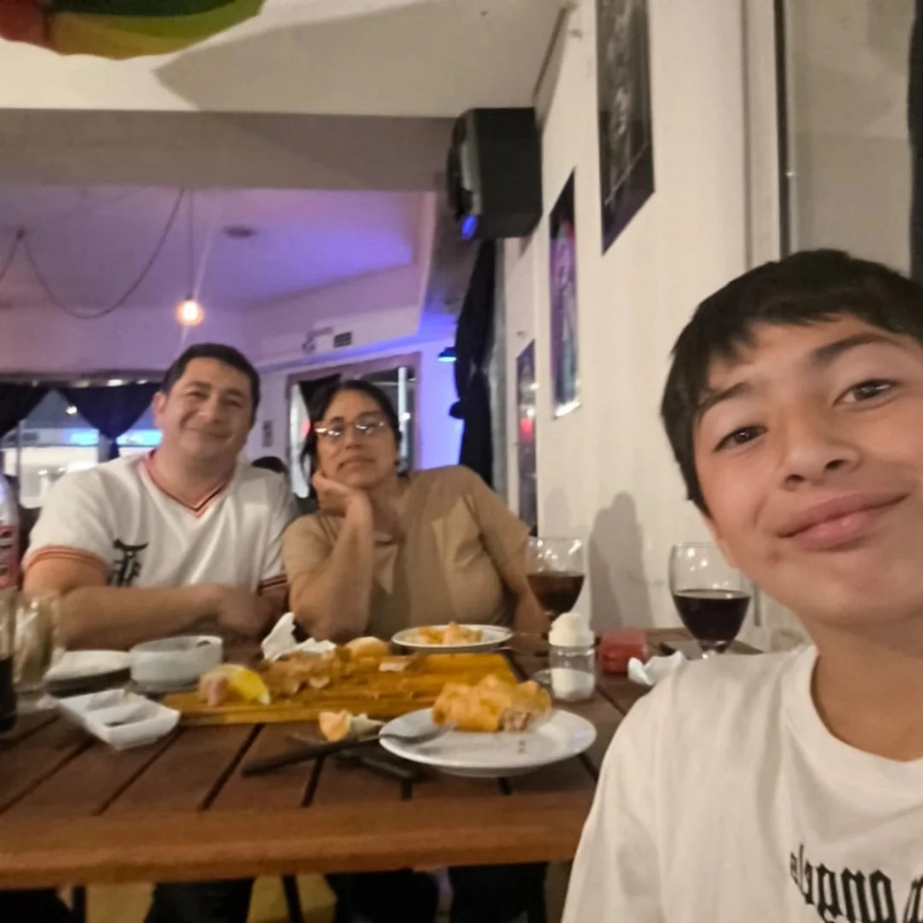 Ian Cabrera aparece en la foto mirando a la cámara, con una sonrisa, mientras se saca una selfie en la mesa. Detrás, sus padres están sentados, con platos y copas servidas. Es una escena simple, de esas que quedan guardadas sin pensar demasiado.