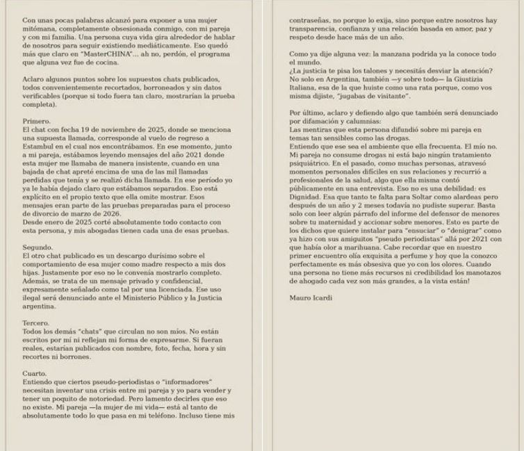 No fue un posteo más. Esta vez, Mauro Icardi avanzó un paso que incomodó incluso a quienes siguen el conflicto desde afuera. En medio de un nuevo cruce con Wanda Nara, el futbolista decidió responder acusaciones con un mensaje extenso en redes y terminó hablando de un aspecto muy personal del pasado de La China Suárez.