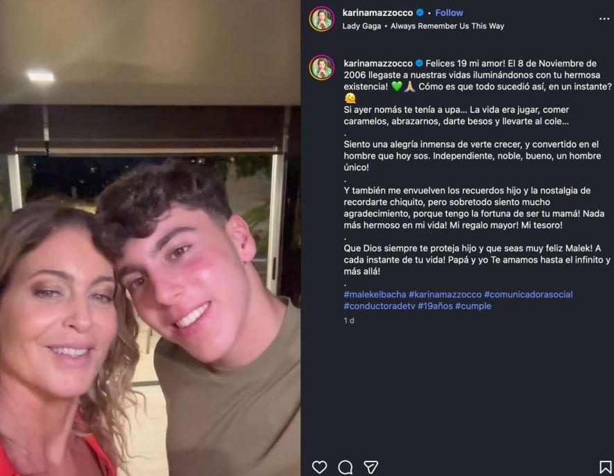 En su saludo de cumpleaños, Karina Mazzocco destacó la independencia, nobleza y bondad de su hijo, y dejó en claro lo que significa para ella este camino compartido: “Siento mucho agradecimiento, porque tengo la fortuna de ser tu mamá. Mi tesoro. Mi regalo mayor”, escribió.