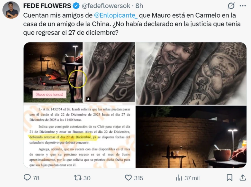 Las imágenes lo ubican en la casa de un amigo cercano a la China Suárez, en Carmelo, compartiendo un fogón. Un detalle no menor terminó de confirmar la identidad: los tatuajes dedicados a sus hijas. La información fue difundida por Fede Flowers, quien puso en palabras la duda que muchos empezaron a hacerse: si el regreso estaba pautado para el 27, ¿por qué seguía en Buenos Aires el 28 por la noche?
