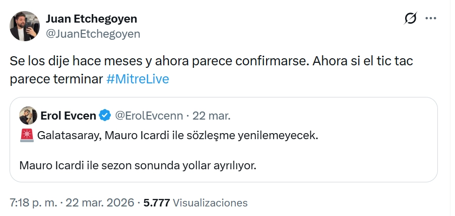 La noticia, que circuló rápidamente en redes sociales, fue confirmada por el cronista turco Erol Evcen. El periodista aseguró que la separación entre el club y el jugador es un hecho consumado para el final de la temporada, marcando lo que parece ser el cierre definitivo de la etapa de Mauro Icardi en el equipo donde supo ser ídolo máximo. El dato también fue replicado por Juan Etchegoyen, quien señaló que esta situación se venía anticipando hace meses.