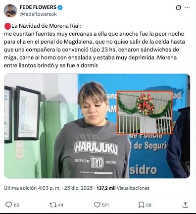 Según detallaron fuentes cercanas, Morena vivió su primera Navidad tras las rejas sin ánimo para compartir con sus compañeras de celda. A diferencia de los festejos tradicionales, ella pasó gran parte de la noche sola, aislada en su celda. Fue recién cerca de la medianoche cuando una de sus compañeras logró convencerla para que saliera a la cena. Sin embargo, la alegría de la celebración fue efímera: la cena consistió en sándwiches de miga, carne al horno con ensalada, y un brindis entre lágrimas.
