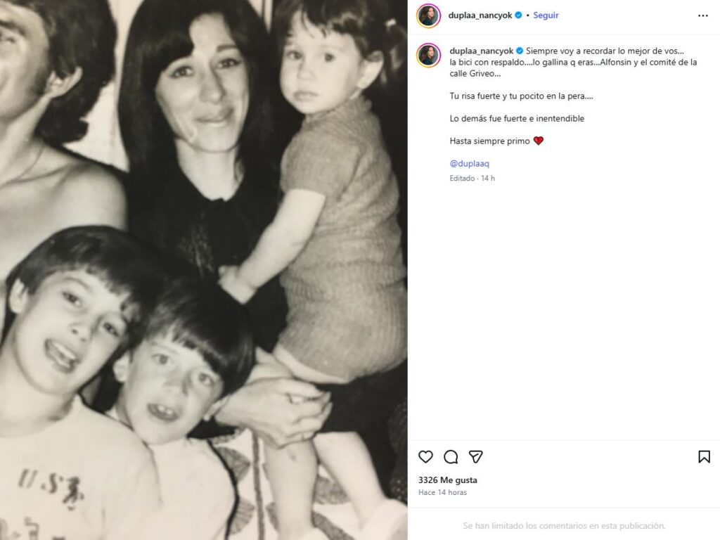 “Siempre voy a recordar lo mejor de vos… la bici con respaldo, lo gallina que eras… Alfonsín y el comité de la calle Griveo”, escribió, aludiendo a momentos vinculados a la militancia y a la niñez en Buenos Aires.