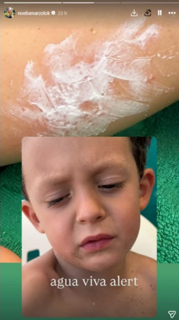 Desde sus redes sociales, la bailarina compartió una imagen contundente. En la foto se ve al nene con un gesto de dolor, de esos que no necesitan explicación. No hubo dramatismo ni palabras de más, solo una advertencia directa: “Agua viva alert”. Un mensaje breve, casi urgente, que dejó en claro que algo había pasado y que merecía atención.
