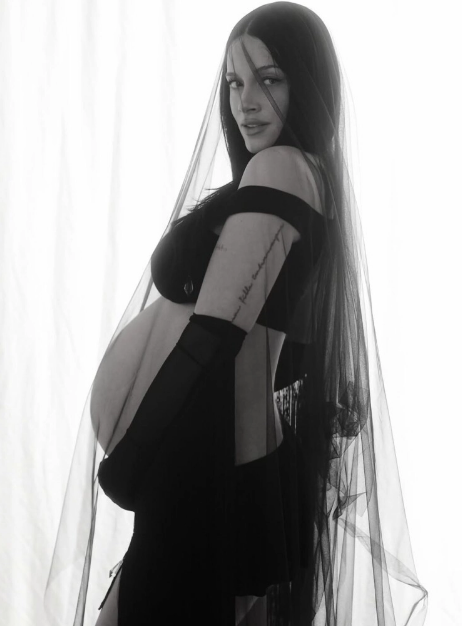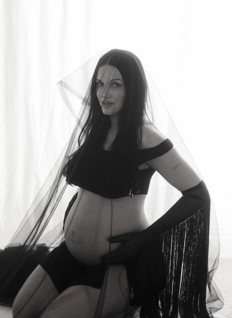 Oriana posó envuelta en tules negros, con una puesta que muchos interpretaron como una “novia gótica” embarazada.