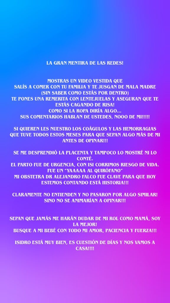 En un video dirigido a sus seguidores, Rocío fue más allá. Contó que atravesó meses muy duros, con hemorragias, una placenta desprendida y un parto de urgencia con riesgo de vida. Detalles que no había compartido antes y que, según dijo, explican el hartazgo frente a las críticas livianas. “Sus comentarios hablan de ustedes, no de mí”, remarcó.