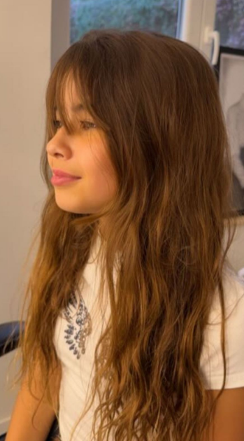 La actriz compartió postales del regreso a Turquía con sus tres hijos y en una de ellas Rufina apareció distinta. El corte recto y largo que había lucido durante el casamiento quedó atrás. En su lugar, eligió un flequillo estilo curtain bangs, largo y desmechado, que enmarca el rostro con suavidad y deja caer el pelo por debajo de los ojos. El resto del cabello sigue largo, pero ahora con capas desfiladas que le dan movimiento y una imagen más fresca.