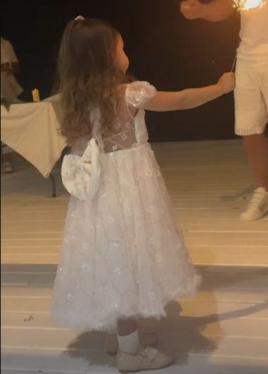 En las imágenes que compartió Barby Franco en Instagram se la ve de blanco, a juego con su mamá, en una elección pensada para la ocasión. El vestido tenía volados suaves, bordados florales delicados y un gran moño en la espalda que terminó siendo el detalle más comentado. Ese lazo, centrado y prolijo, aportó un aire clásico que contrastó con la frescura de la escena familiar.