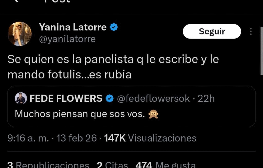 El mensaje fue directo y quedó registrado. A través de sus redes sociales, Yanina Latorre lanzó una información que sacudió el ambiente del espectáculo: “Sé quién es la panelista que le escribe y le mandó fotulis… es rubia”.