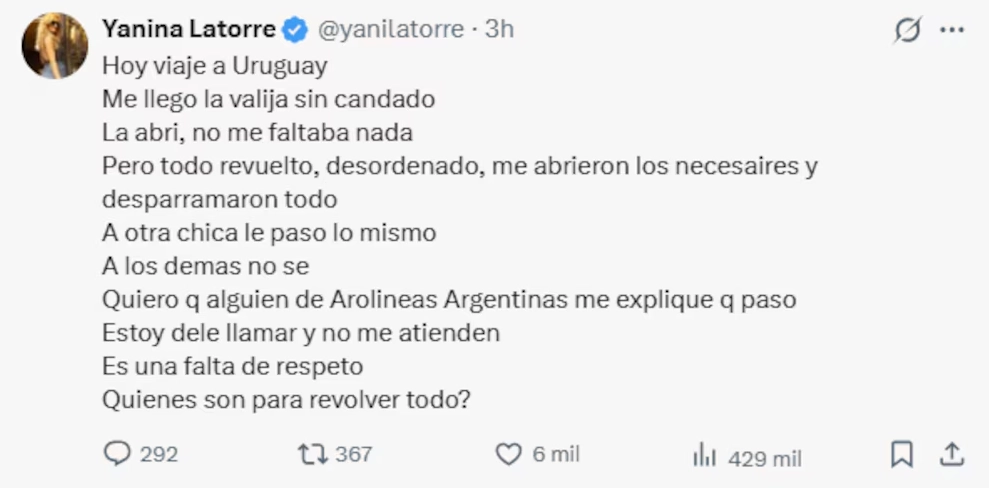 El reclamo de Yanina Latorre a Aerolíneas Argentinas