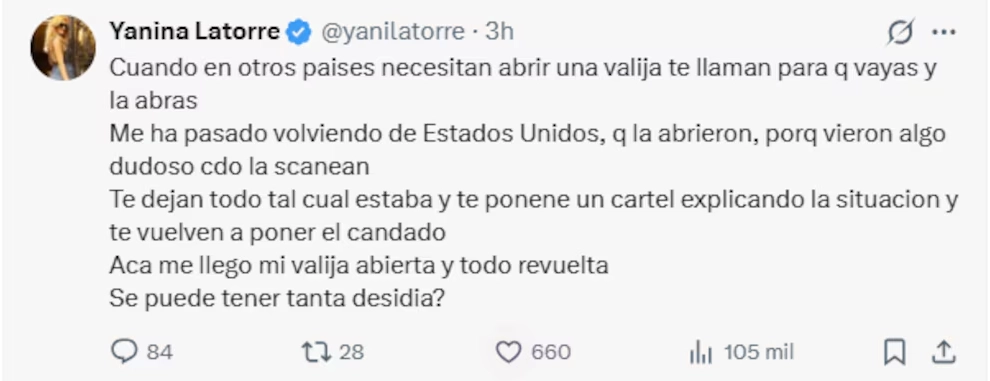 Yanina también recordó que ya le ocurrió que revisaran su equipaje en viajes anteriores.